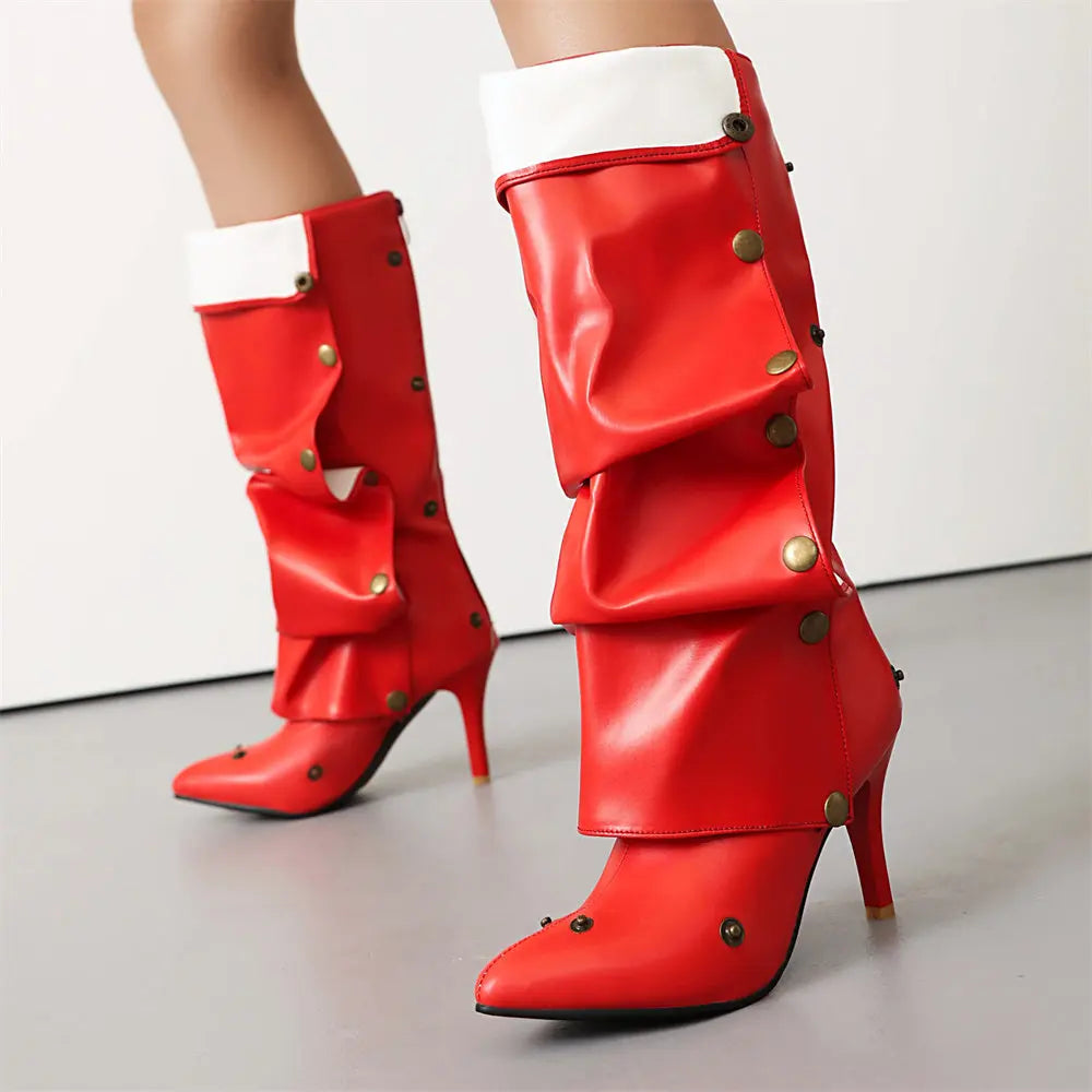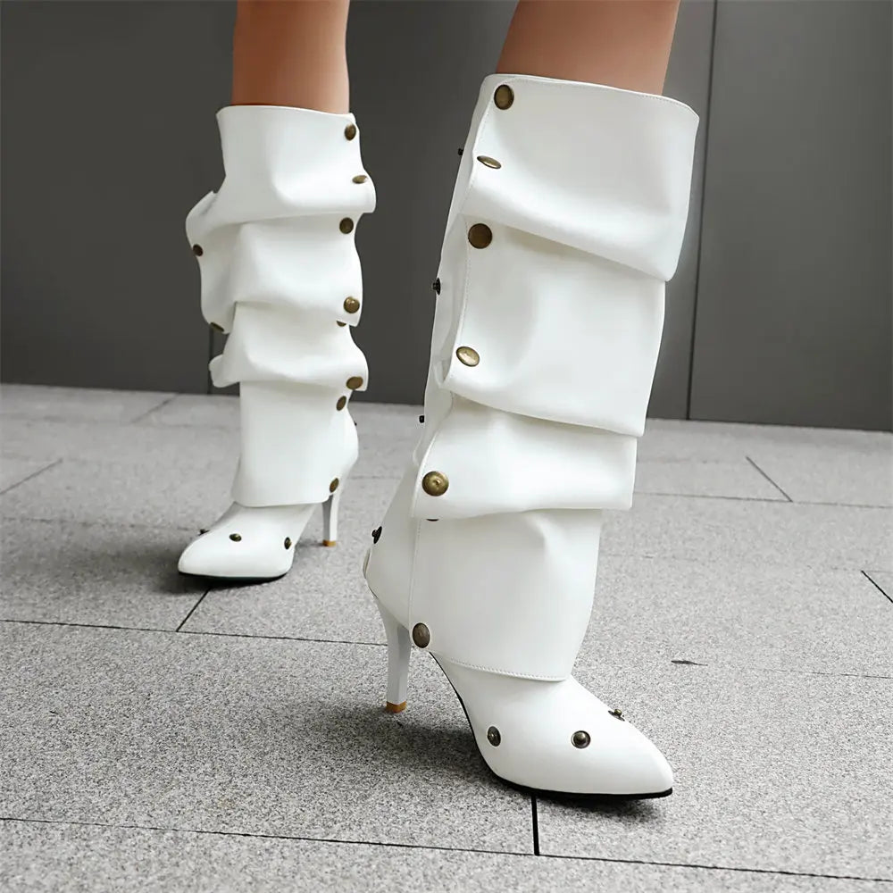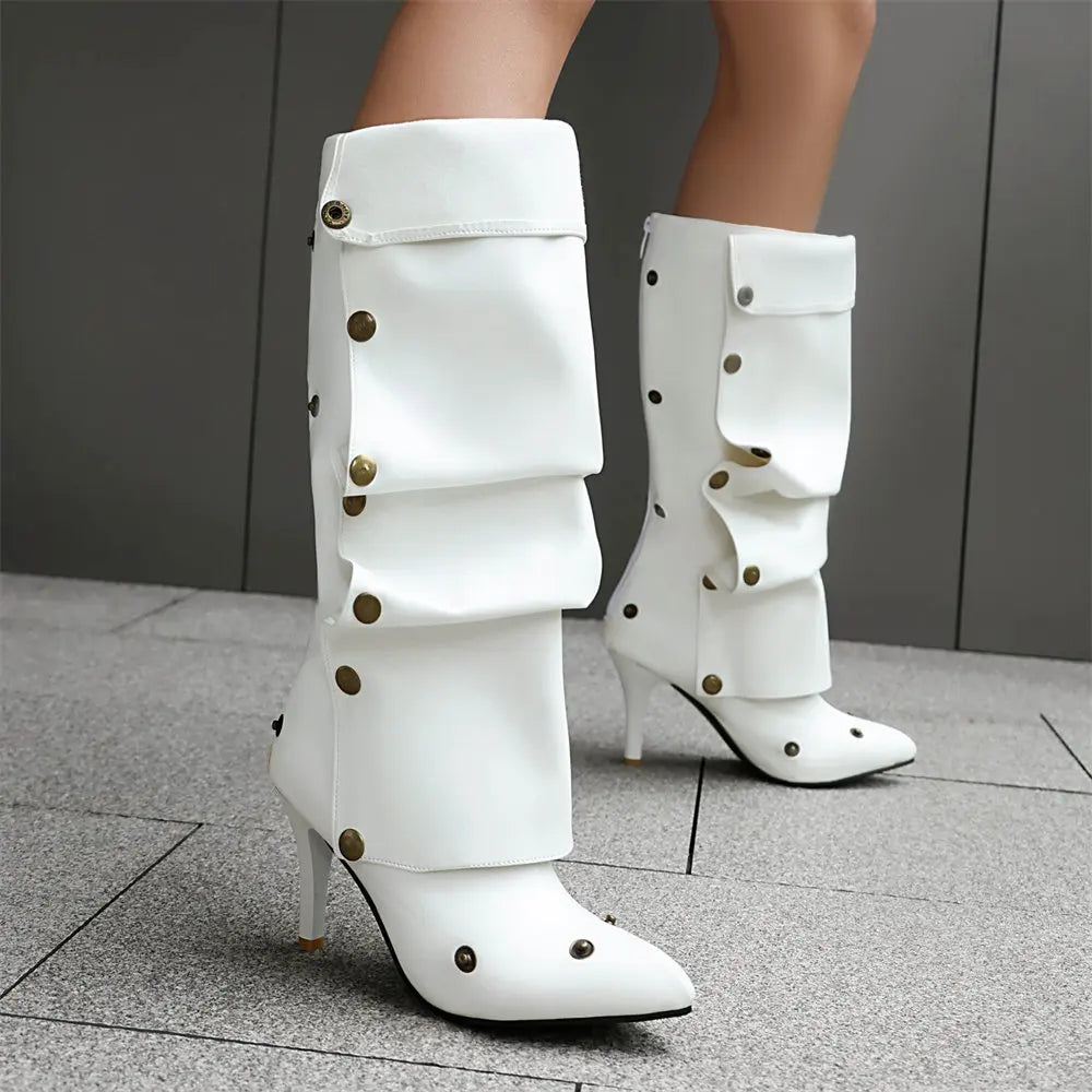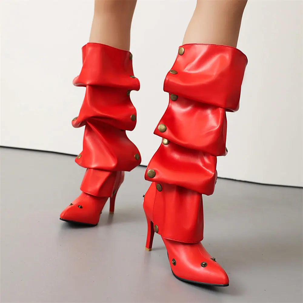 All eyes fall here first. The Cascade’s layered folds climb high, held with snaps that catch the light with every step. A pointed toe and elevated heel finish the silhouette: bold, sculptural, unapologetically loud.