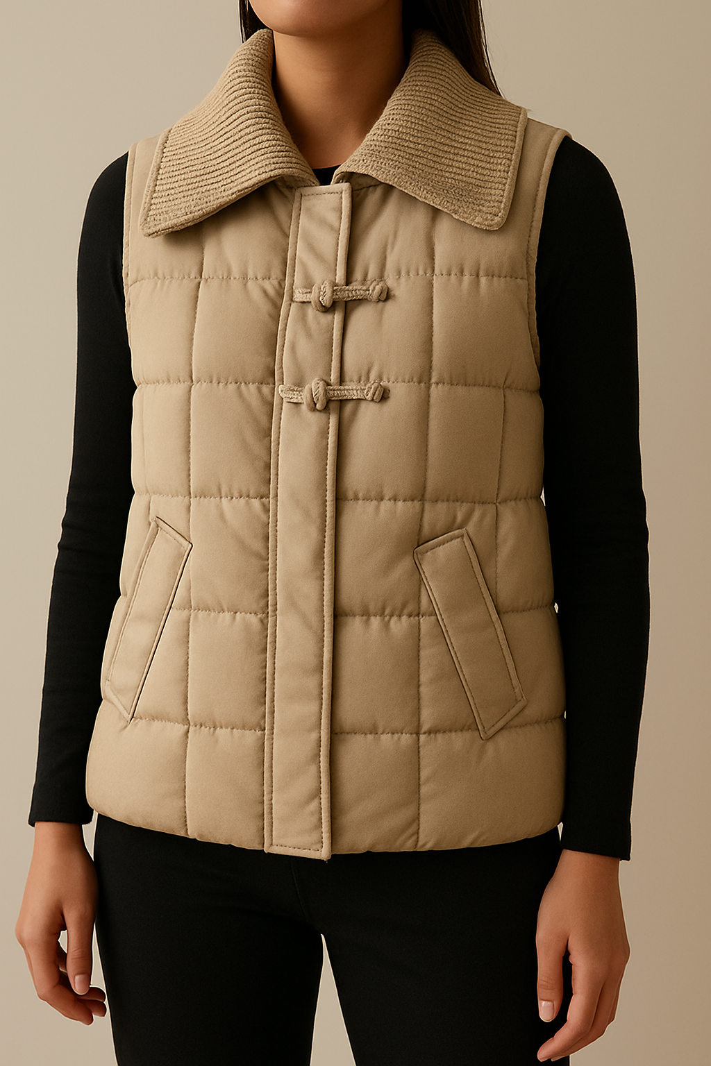 Soft quilting drapes like a woven mosaic, each square stitched with deliberate symmetry. The collar, ribbed and substantial, frames the neckline in textured contrast. Perfect for the first bite of autumn air, it adds warmth without weight.