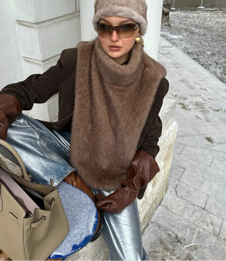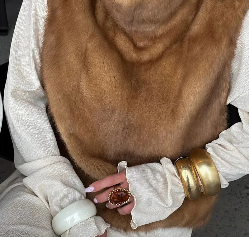 Soft faux fur falls in a clean, weighted drape that instantly sharpens simple winter layers. A tall collar frames the neckline with sculptural warmth, giving every outfit a calm, expensive presence. Made for women who want texture to speak softly but unmistakably.