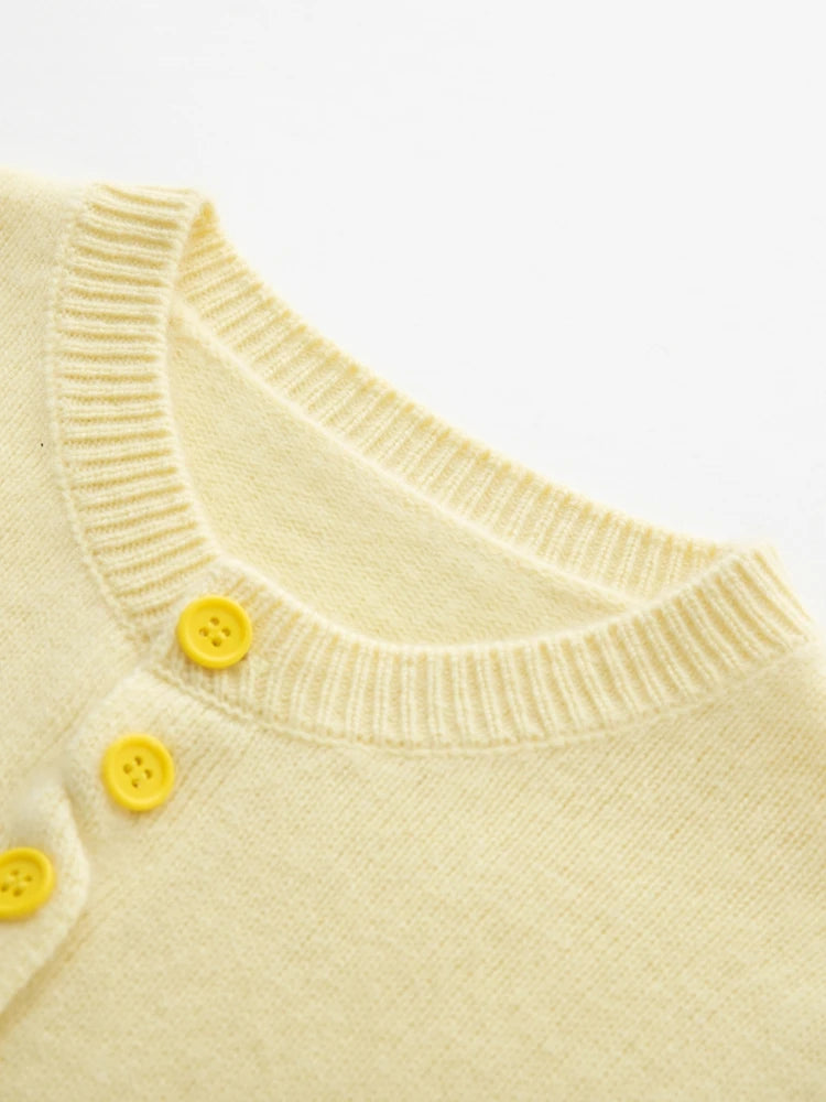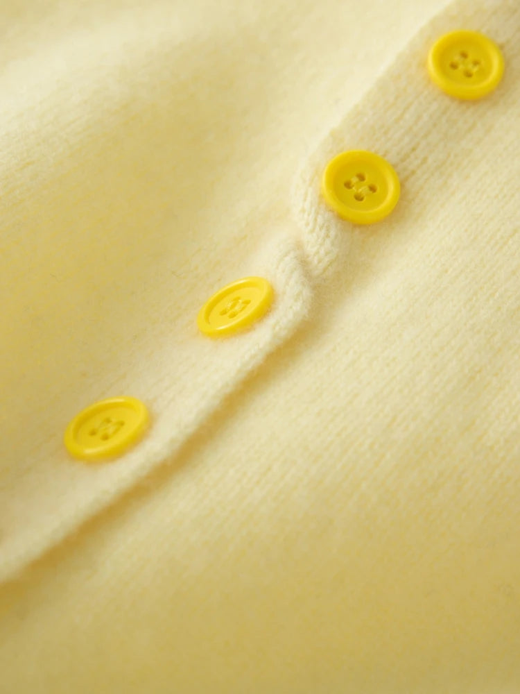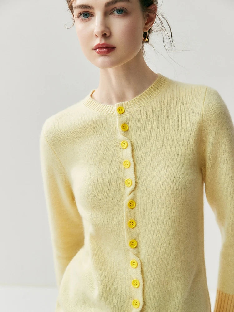 Fine cashmere drapes close to the frame, the knit shifting softly at the wrist. Bold ribbed cuffs mark the edge in clean contrast, echoed by a row of tonal buttons. A quiet rhythm between texture and restraint.