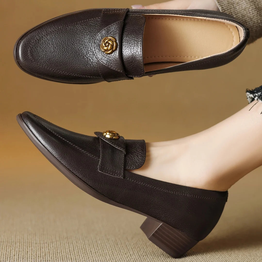 Supple leather folds naturally across the foot. The camellia accent sits centered, small yet deliberate. A low heel grounds the form for steady wear through every season.