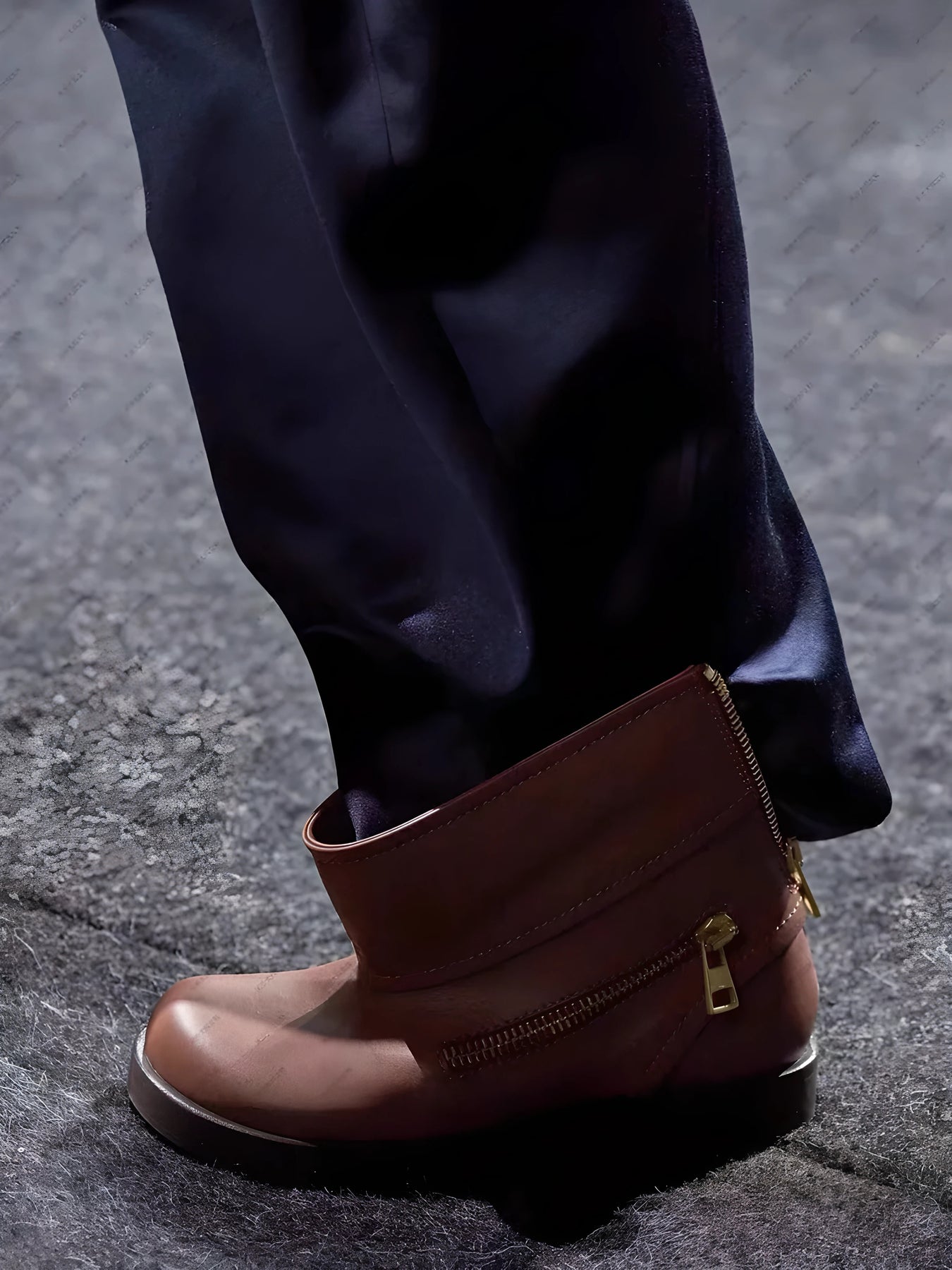 Designed with angles that push beyond the ordinary, these boots fold ahead of their time. The slanted cut and exposed zippers turn structure into statement, balancing edge with everyday wear.