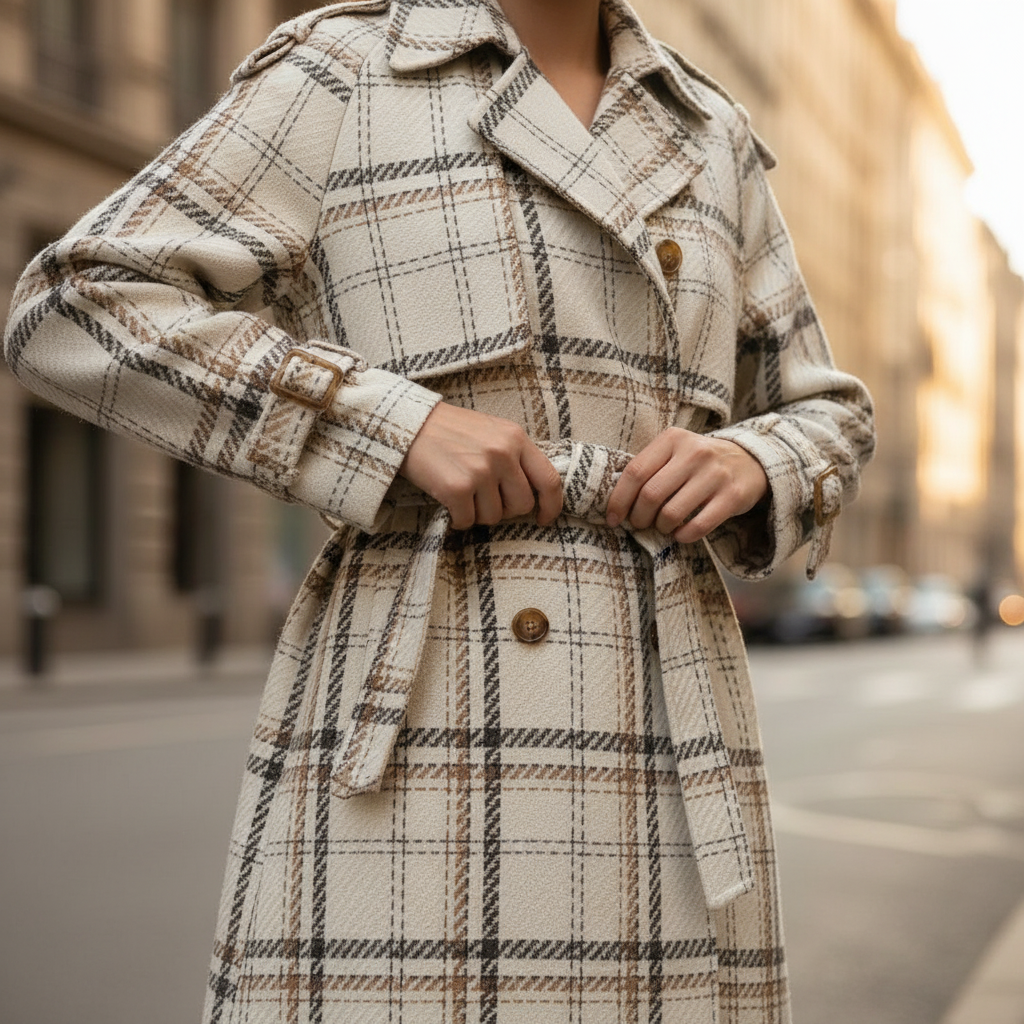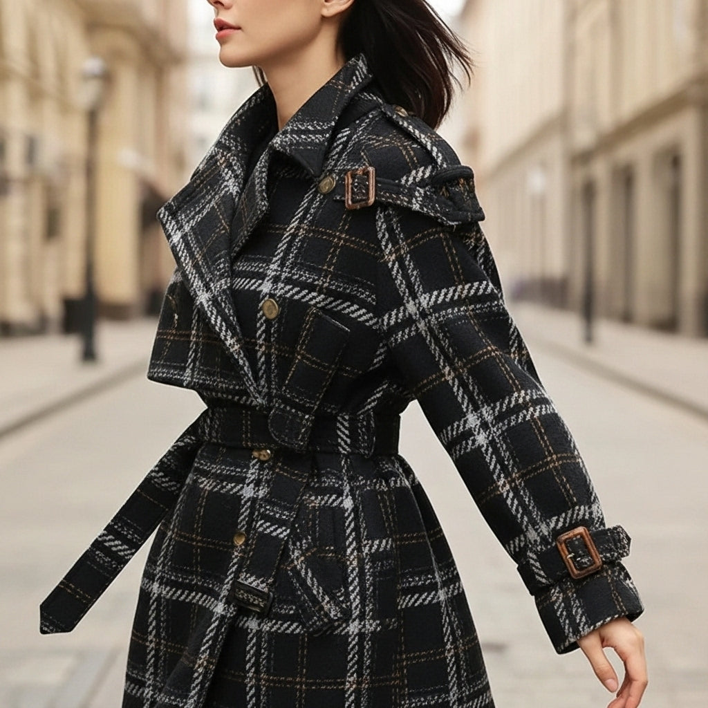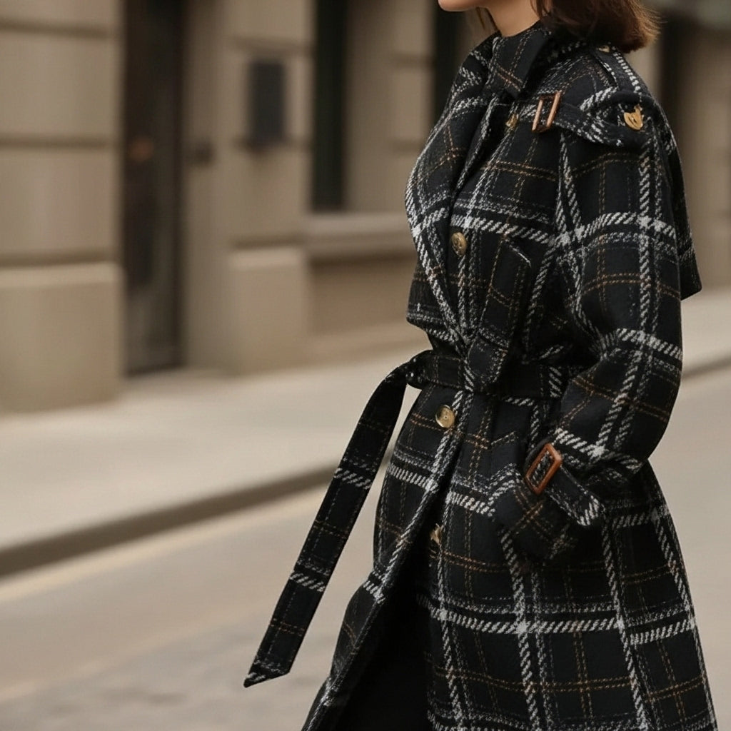 Wool gives this coat its warm, grounded structure, shaping the plaid panels into a silhouette that feels both classic and modern. The double-breasted front and high neck fasten neatly, adding extra protection when the temperature drops. A balanced long cut and subtle volume let it pair well with winter outfits without feeling bulky.